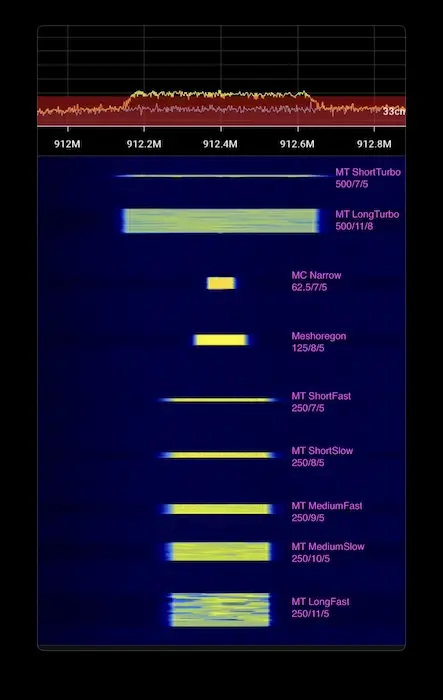LoRa packets come in a wide variety of shapes and sizes, depending on their parameters. These shapes bring with them pros and cons. One of the biggest impacts is the airtime. Meshes have to choose between range, noise tolerance, and time on the air, finding the right balance of link reliability and congestion for their density and location.